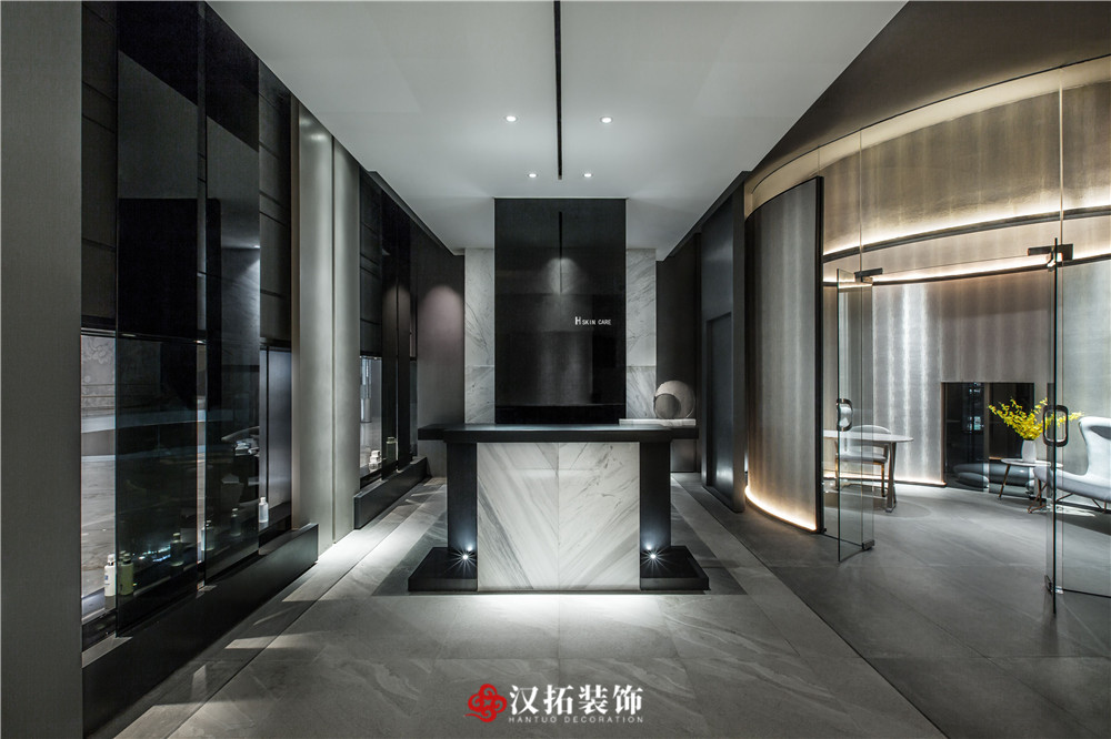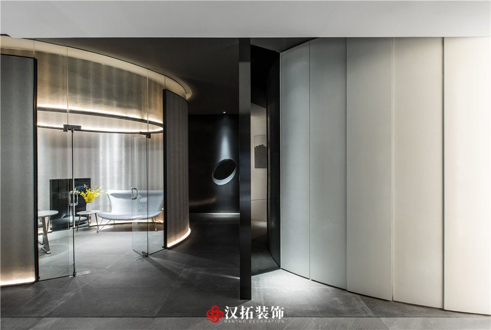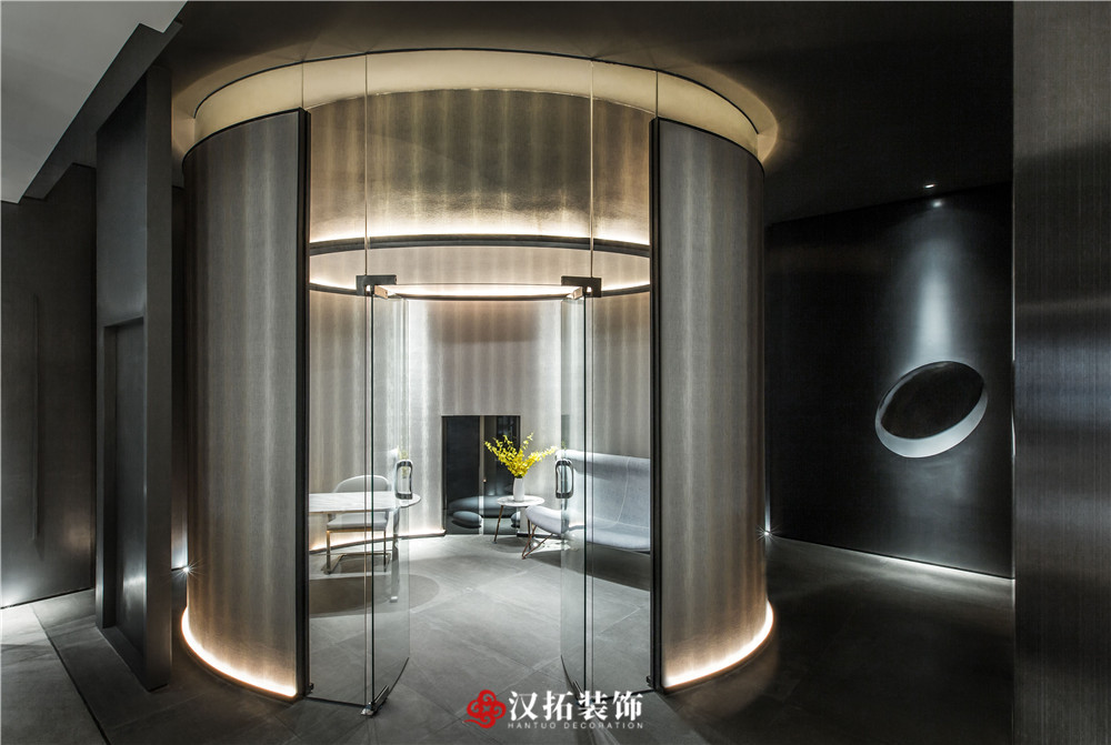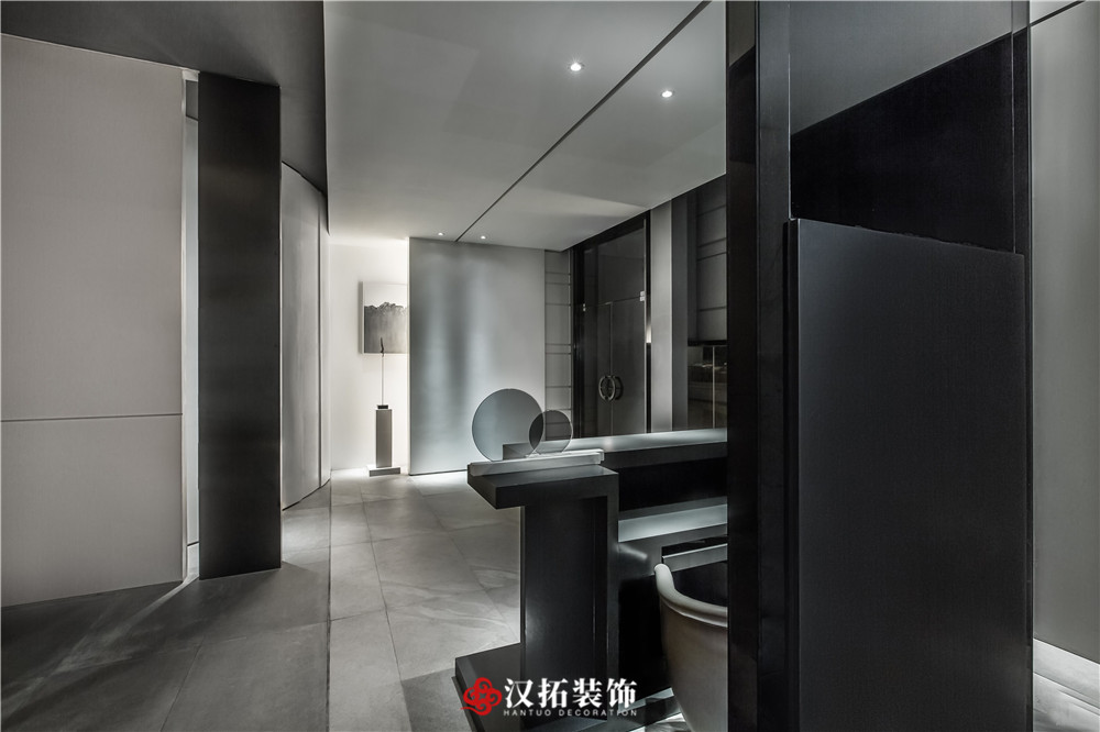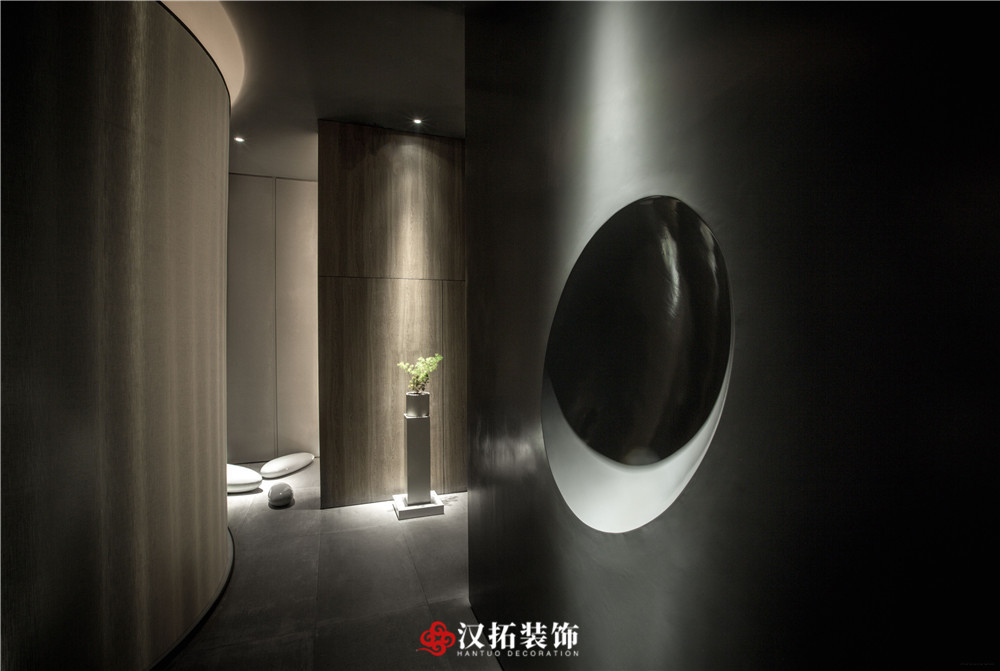 設(shè)計說明:為了突出空間的縱深感,從入口處這個位置開始,把視覺壓的很低,留出一點借景窗,引人進入到內(nèi)部空間,這里通過對比,黑白,高低設(shè)計體量的控制,通過這種平、框、曲、長,中國園林的手法,把整個空間該有的視覺若隱若現(xiàn)的控制在這里。