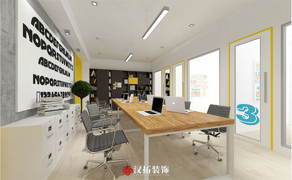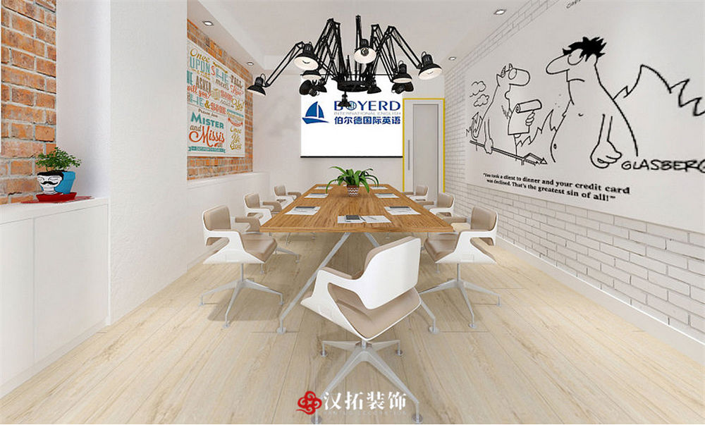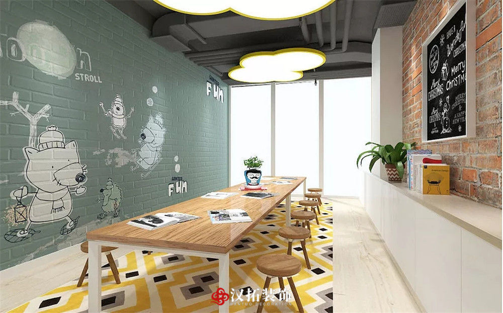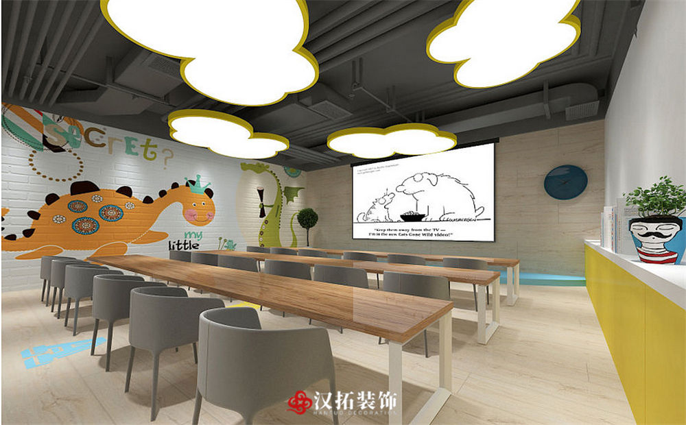 設(shè)計說明:配色簡約,桌子以木質(zhì)為主,椅子適當(dāng)?shù)倪\用暖色調(diào)提升空間的溫暖度,墻面的壁紙充滿童趣和藝術(shù)感,整個搭配使人輕松愉悅。