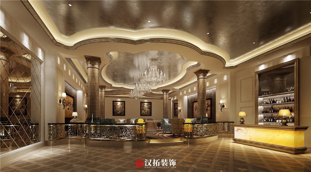 設(shè)計(jì)說明:將傳統(tǒng)元素與現(xiàn)代藝術(shù)表達(dá)完美統(tǒng)一,打造出舒適雅致的休閑場(chǎng)所。和諧的色彩搭配結(jié)合燈光設(shè)計(jì),金屬質(zhì)感的材質(zhì)和精致的紋路的演繹,在凸顯典雅氣質(zhì)的同時(shí),給人放松、自在的休閑空間,暢享人生之悅。