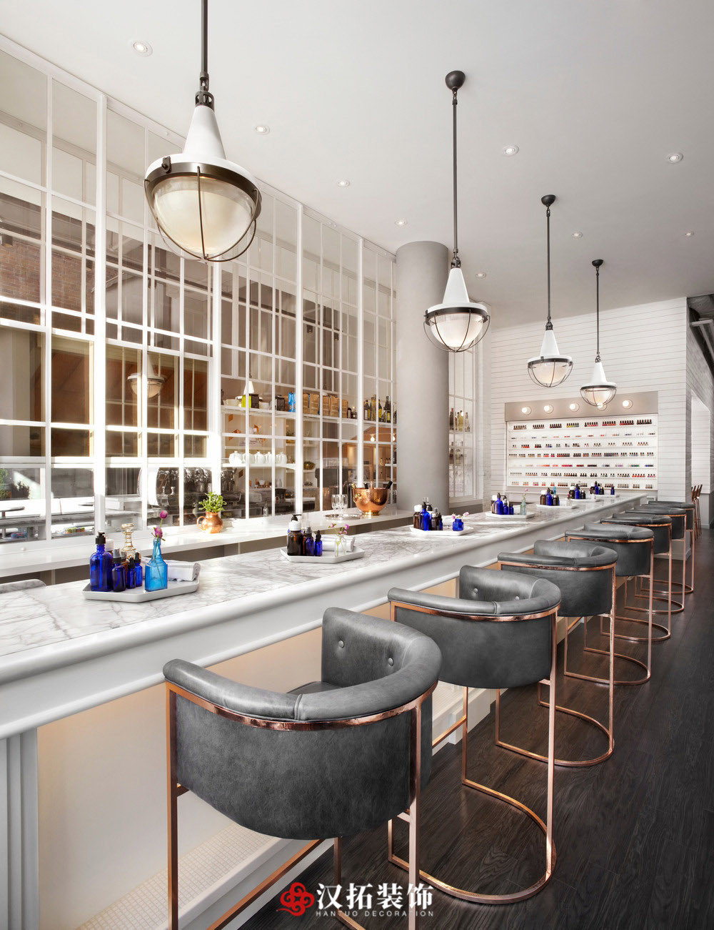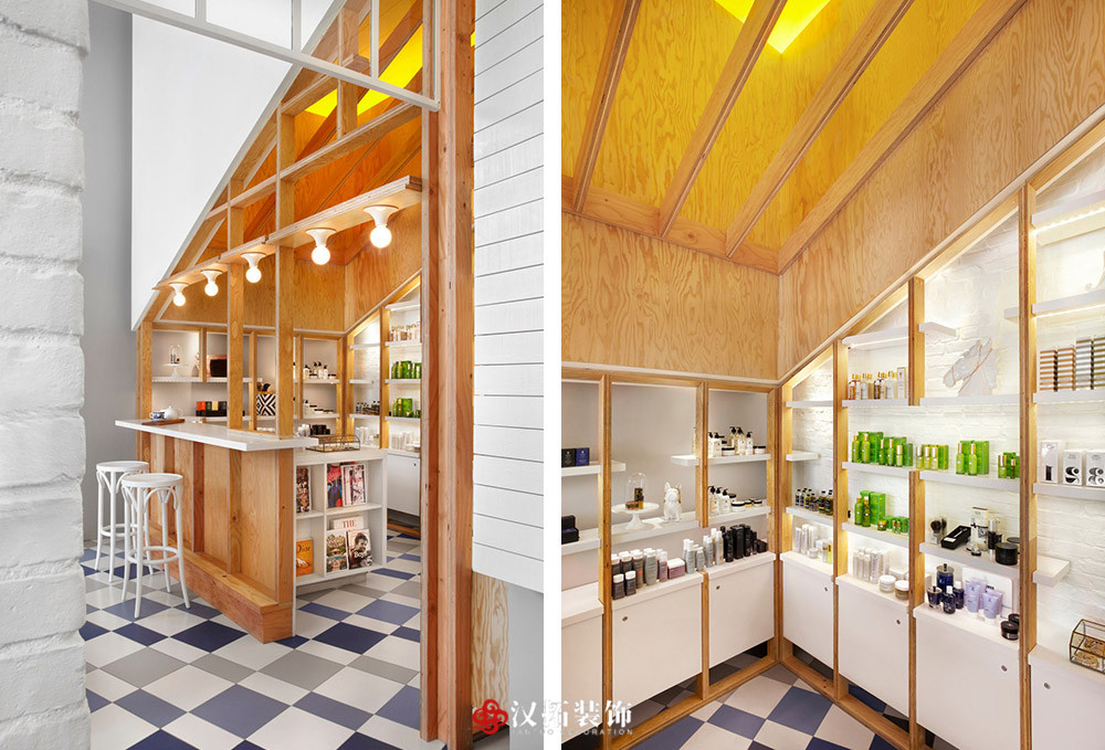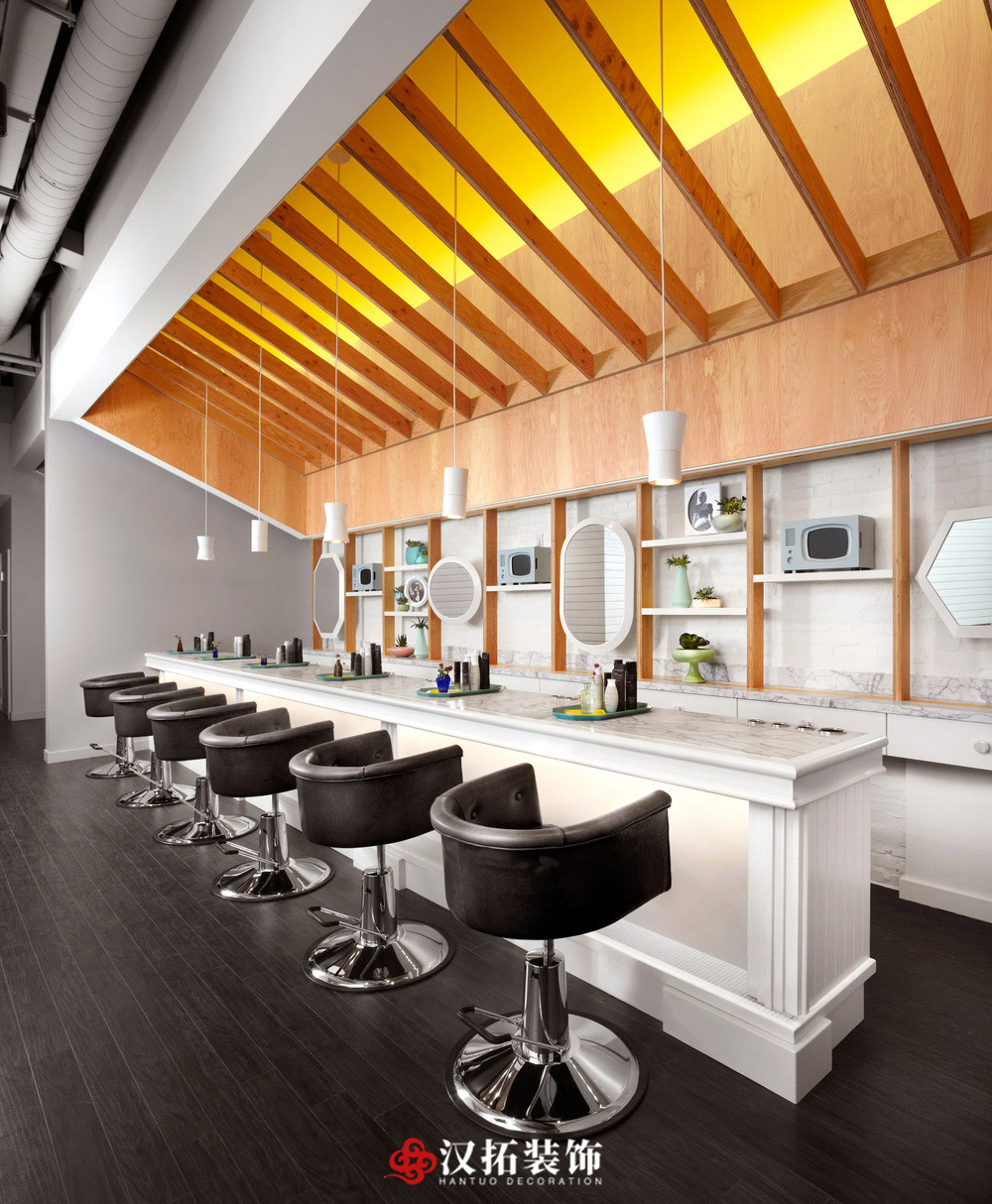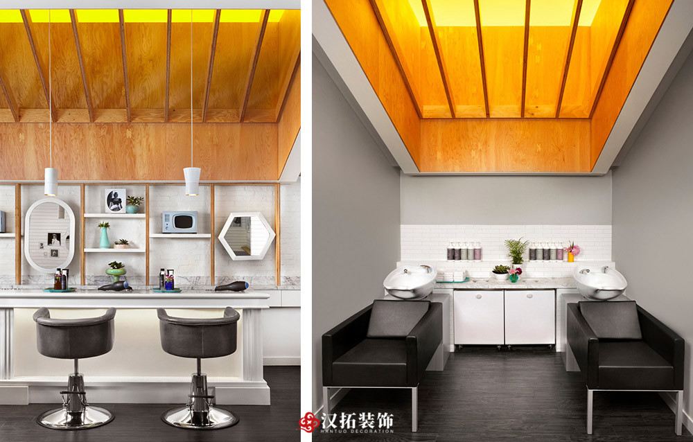 設(shè)計(jì)說(shuō)明:店鋪內(nèi)的主色調(diào)選擇比較輕快明了的色彩,頂部使用大面積的明黃,使得空間更加跳躍活潑,增加通透感,店內(nèi)工具擺放整齊,干凈又美觀。