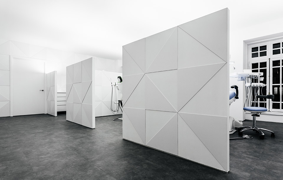 設計說明:項目中的幾何圖案被運用在墻壁,家具,照明和門板上。采用三種材料詮釋:石膏板墻,PVC面板以及波雷爾毛紡織物–其可以運用在墻面上當吸聲板。在等待室,照明燈具也融于墻面的圖案,此外房間中的等候長椅也運用了設計中的三角形特色元素。一道印有設計圖案的門隔開了等候室和診療場所,進入診療場所,四個治療位被低隔斷分割,剩下一個治療位因為采用X射線系統(tǒng)而被墻壁完全的分割。此外還有一個辦公室,工作室,更衣室,以及浴室。