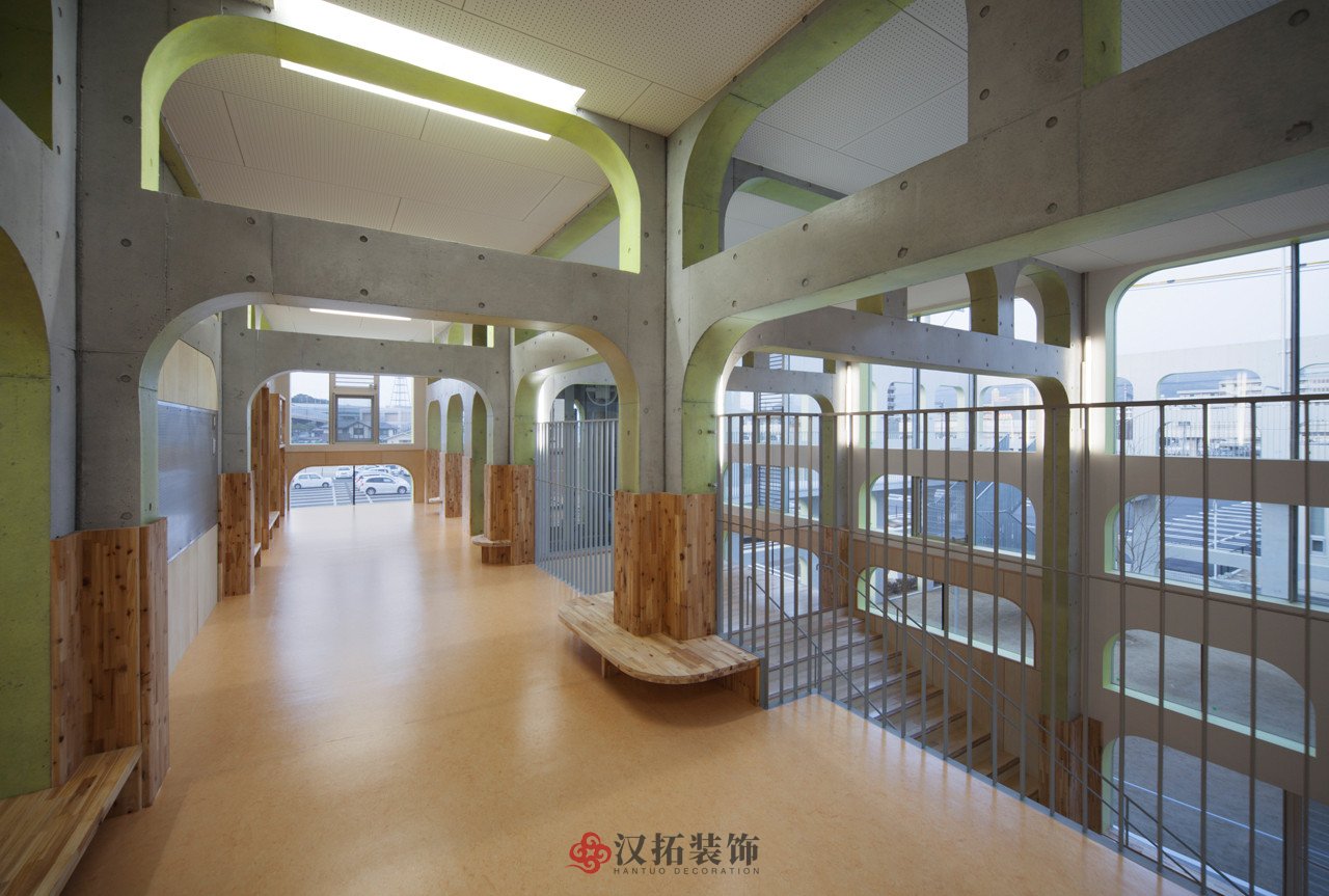 設計說明:本設計外建筑頗具特色,墻體上多是弧形洞口,能引起幼兒的興趣。