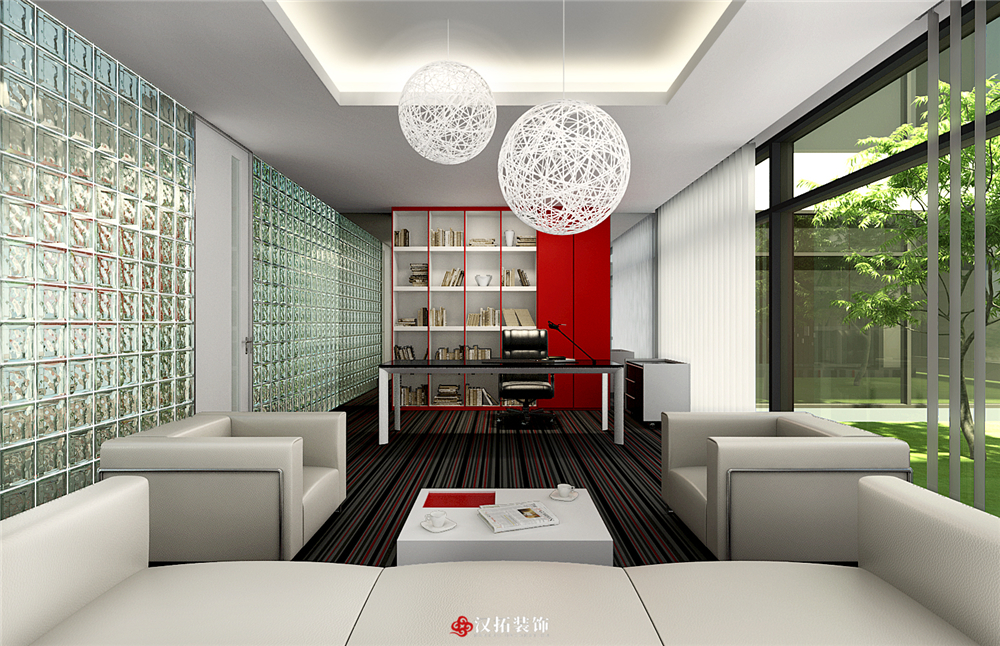 設(shè)計說明:預(yù)算:52萬 將明度較高的綠引入辦公室,再加以紅色的撞色設(shè)計,使人眼前一亮